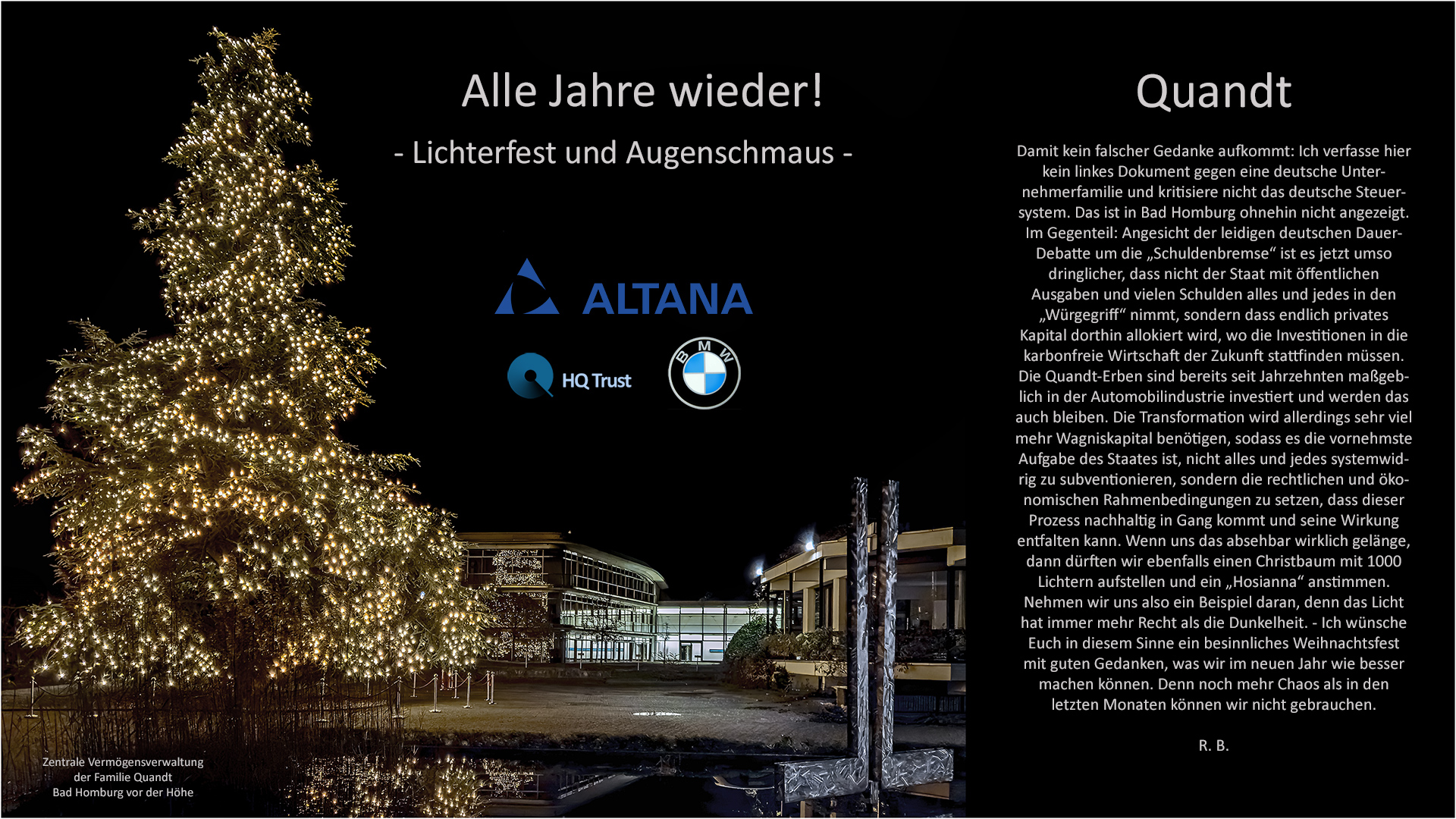 Soweit ist es in Bad Homburg aber noch nicht. Daher hat die Familie Quandt wie jedes Jahr die grandiose Tanne vor den Verwaltungsgebäuden zum Christbaum der 1000? Lichter umfunktioniert, der mich gestern Abend so stark blendete, dass ich mir die Augen reiben musste.