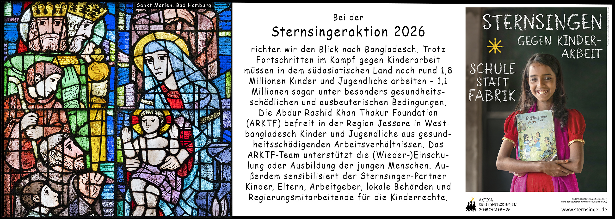 Rechtes Bild: Menschwerdung Gottes nach Lukas 2, 1 ff mit zwei Besonderheiten: Nicht das Jesuskind liegt in der Krippe, sondern das Glaubenszeugnis des Evangelisten Johannes (das Wort ist Fleisch geworden); und der Anklang an das Kreuz Jesu ist rechts hinten der Holzträger des Stalles.