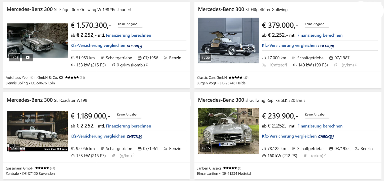 Beide Versionen des 300 SL, Roadster wie Flügeltüren-Coupé, waren von Anfang an ausgesprochene Liebhaberfahrzeuge und haben bis heute nichts von ihrer Faszination verloren; sie gehören seit Jahren zu den gesuchtesten und bestnotierten Klassikern.