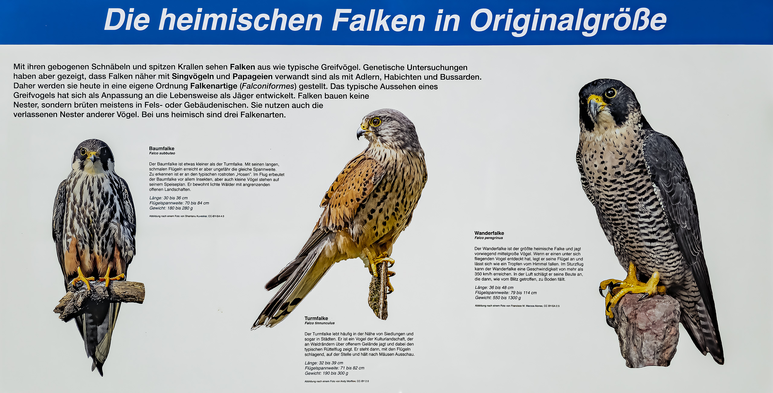 Turmfalken (31 bis 37 cm groß) sind Kulturfolger, die gerne in vom Menschen geprägten Gebieten brüten. Früher nutzten sie alte Baumhöhlen zum Nisten, heute werden diese oftmals durch Kirchtürme ersetzt. Sie zählen nach dem Mäusebussard zu den häufigsten Greifvögeln in Mitteleuropa.